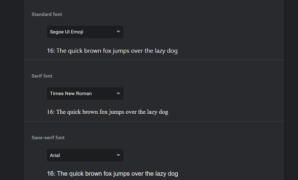 现在,您可以指定要在 Standard、Serif、Sans-serif 和 Fixed-width 字体类型中使用的字体样式。