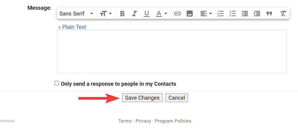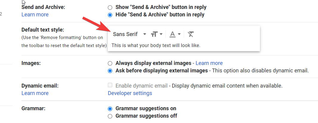 现在单击第一个下拉菜单以选择要应用于将来撰写的所有电子邮件的文本样式。完成后,滚动到页面底部,然后单击“保存更改”按钮。