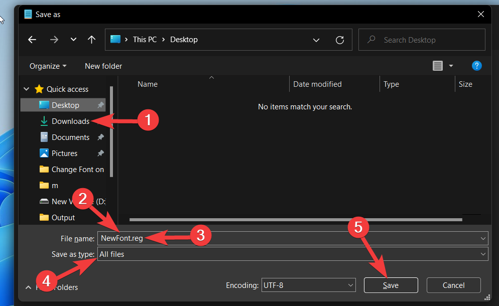 完成后,使用Ctrl + S快捷方式保存文件。在“另存为”窗口中,选择“桌面”作为文件位置。为文件分配一个有意义的名称并将 .reg 作为文件扩展名。不要忘记在“另存为类型”下拉菜单中设置“所有文件”。完成后,点击右下角的“保存”。