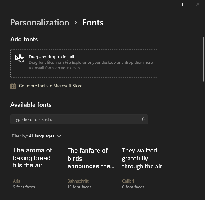 要安装从第三方网站下载的字体,可以将它们从桌面拖放到 Microsoft Store 链接上方提供的框中。