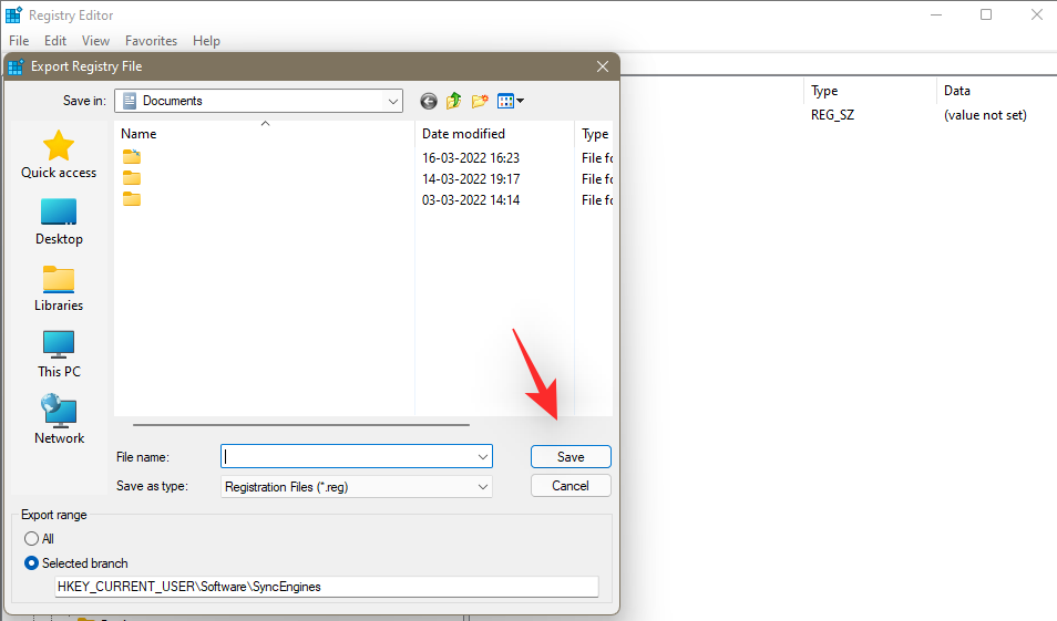 Ctrl + S使用桌面的快捷方式保存文件。选择“保存类型”作为“所有文件”并在文件名末尾使用 .reg 扩展名。最后,完成后单击“保存”。