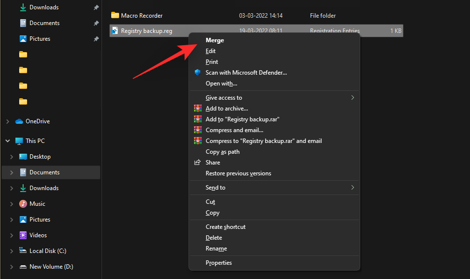 导航到我们保存在本地存储中的注册表备份文件。找到后,右键单击它并选择“合并”。