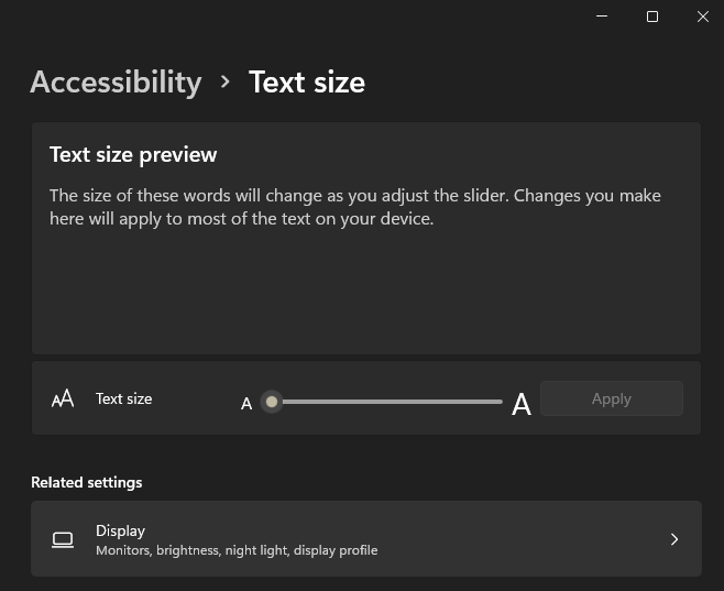 您可以在此处移动滑块以获得所需的文本大小。在应用更改之前,您可以在文本预览窗口中预览结果。
