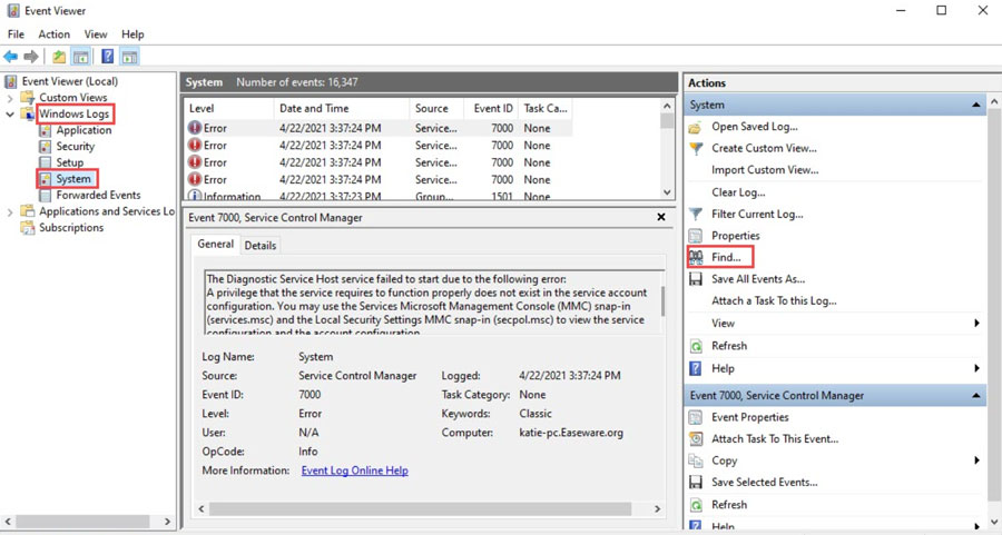 - 首先,点击 Windows 日志 > 系统 > 查找。