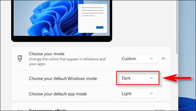 如果您在上述步骤中选择了“自定义”,请使用“选择默认 Windows 模式”旁边的下拉菜单选择“深色”。这将允许您将颜色应用于任务栏。(在“选择默认应用模式”下,您可以选择任一选项。)