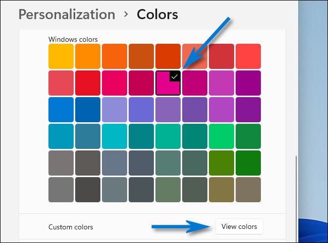 在“强调颜色”部分中,在网格中选择要应用到任务栏的颜色。您还可以通过单击“查看颜色”来选择自定义颜色。