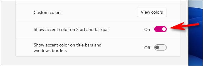 接下来,将“在开始和任务栏上显示强调色”旁边的开关翻转到“开”。