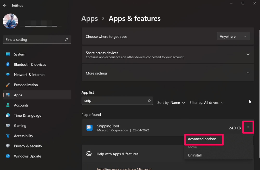 - 现在,点击 三点 菜单并选择 高级选项。