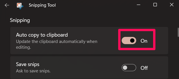 您还可以尝试在截图工具上打开自动复制到剪贴板模式,因为许多用户声称这有助于他们解决 Windows 11 截图工具损坏错误。去做这个,