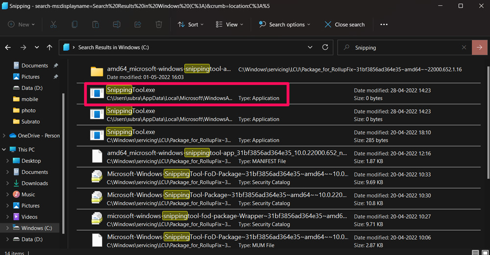 - 或者,您也可以直接从 Windows 文件资源管理器的文件夹搜索菜单中搜索 Snipping Tool。