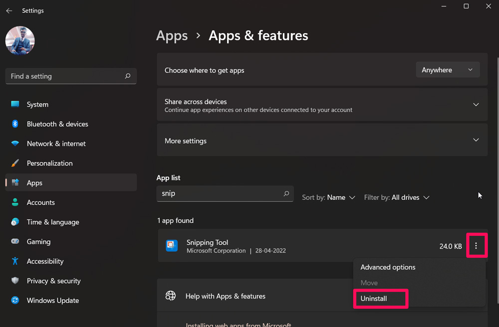 - 然后,单击 三点 按钮并单击 卸载 按钮。
