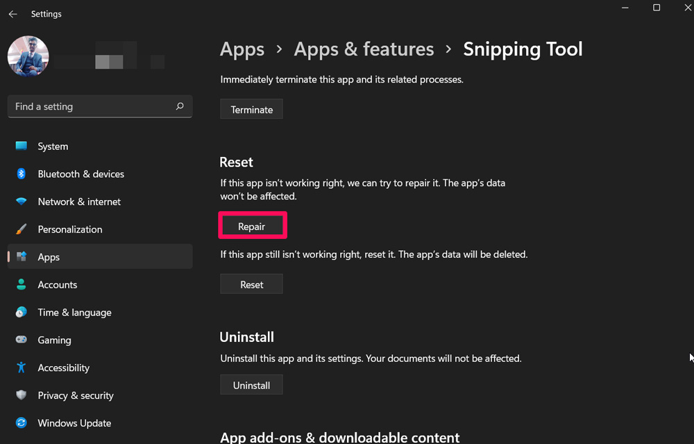如果上述疑难解答对您没有帮助,那么您必须尝试修复您的 Snipping Tool 文件,因为文件可能存在一些问题。所以,要做到这一点,