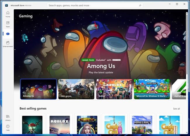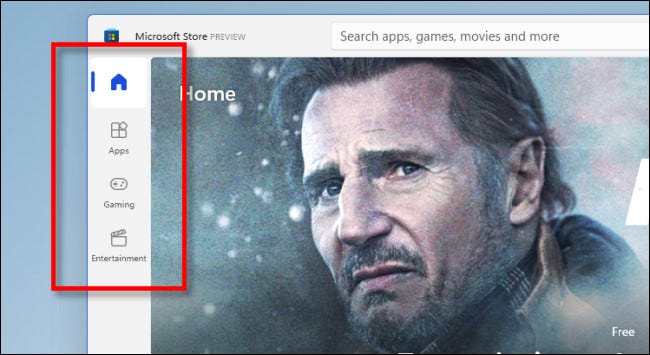 一开始确实很突出:新的商店设计在带有简单图标的侧边栏中列出了主要类别,例如“应用程序”、“游戏”和“娱乐”。(旧版本的 Microsoft Store 会在窗口顶部列出这些类别,但没有图标。)