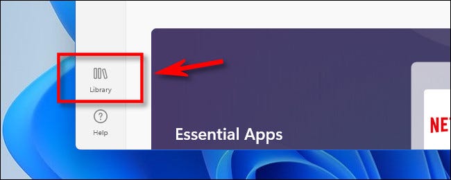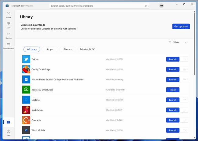 如果您单击 Microsoft Store 预览侧栏中的“库”图标,您将看到您从商店下载或购买的所有应用程序的概览。与旧版本的商店相比,界面似乎简化了。您仍然可以在窗口顶部应用过滤器,但缺少可让您按“拥有”、“已安装”、“下载”和其他类别排序的侧边栏。