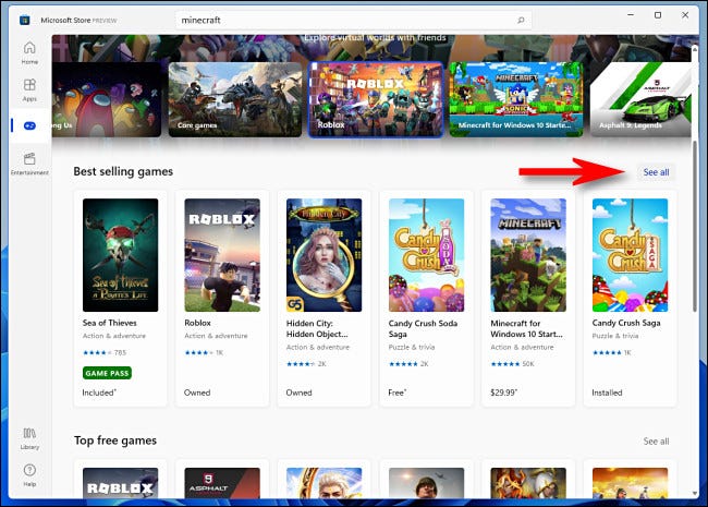如果您向下滚动任何类别页面,您会发现按子类别排序的应用程序列表,每个列表都有自己的标题图稿缩略图。例如,在游戏页面上,您会找到应用子类别,例如“畅销游戏”、“热门免费游戏”和“新的和著名的 PC 游戏”。对于任何类别,您都可以单击“查看全部”以查看更长的应用程序列表。