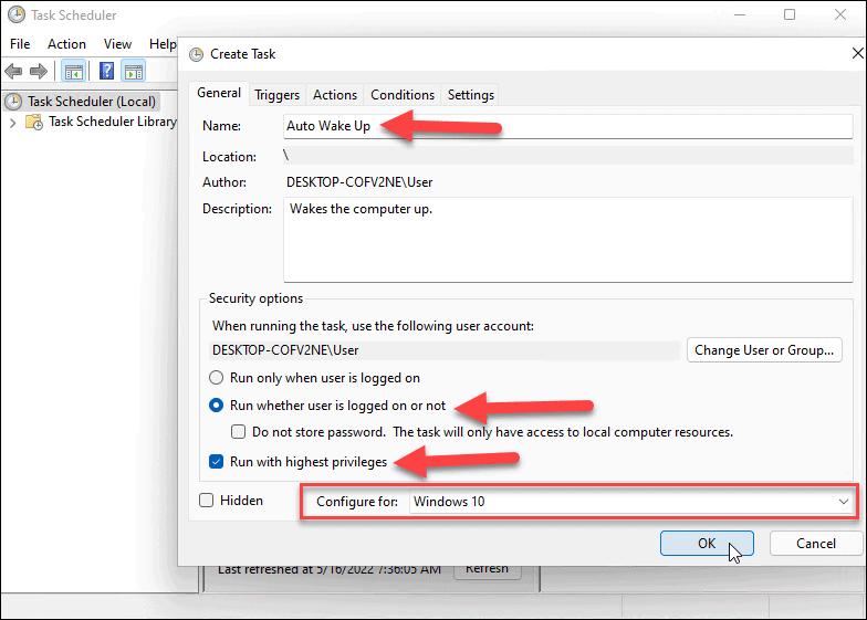 - 在Name字段的General选项卡下,输入任务的名称(例如Auto Wake Up)。