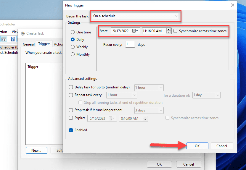 - 现在,将Begin the task下拉菜单设置为On a schedule。
