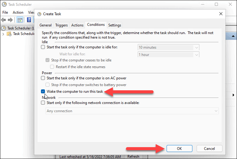 - 单击条件选项卡,在电源部分下选择唤醒计算机以运行此任务,然后单击确定。