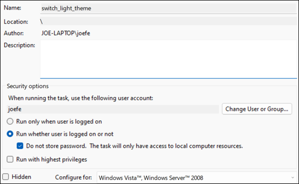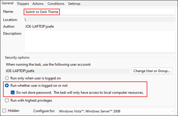 为任务命名,例如“switch_dark_theme”,然后选择“仅在用户登录时运行”和“不存储密码”。