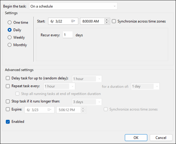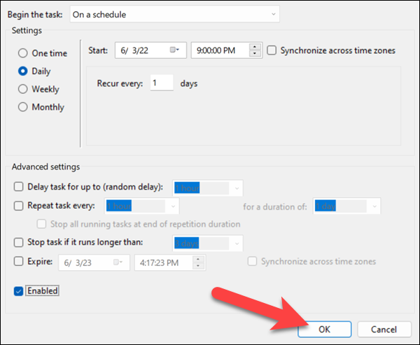 从侧边栏中选择“每日”。现在我们可以输入您希望启用暗模式的时间。确保“Recur Every”选项设置为“1 days”,然后单击“OK”。