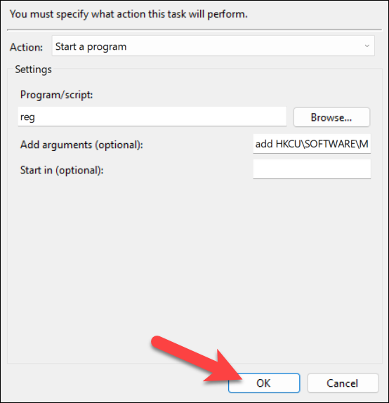 对于操作,我们想要“启动程序”。然后,将以下行粘贴到“程序/脚本”和“添加参数”框中,然后单击“确定”。