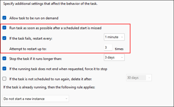转到“设置”选项卡。” 选择“错过计划启动后尽快运行任务”选项并选中“如果任务失败,请重新启动每个选项”并将其设置为 1 分钟和 3 次重新启动尝试。