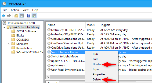不想再使用任务了?返回“任务计划程序库”文件夹并右键单击每个任务。从菜单中选择“禁用”或“删除”。“禁用”将保留任务,但只是停止运行。