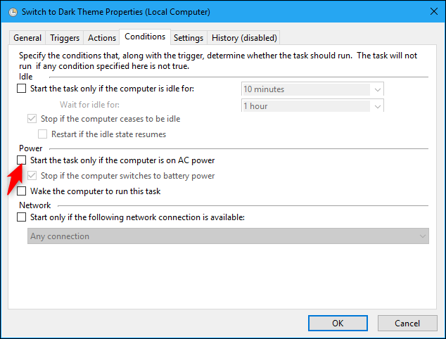最后,转到“条件”选项卡并取消选择“仅当计算机使用交流电源时才启动任务”选项。即使您使用电池供电的笔记本电脑,这也可以确保任务运行。点击“确定”。