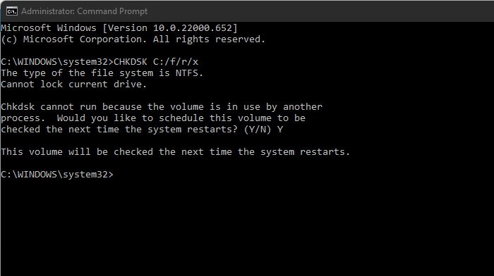CHKDSK C:/f/r/x - 该命令不会开始运行,因为您设备的根驱动器已在使用中。相反,它会在您重新启动 PC 时要求您开始扫描。