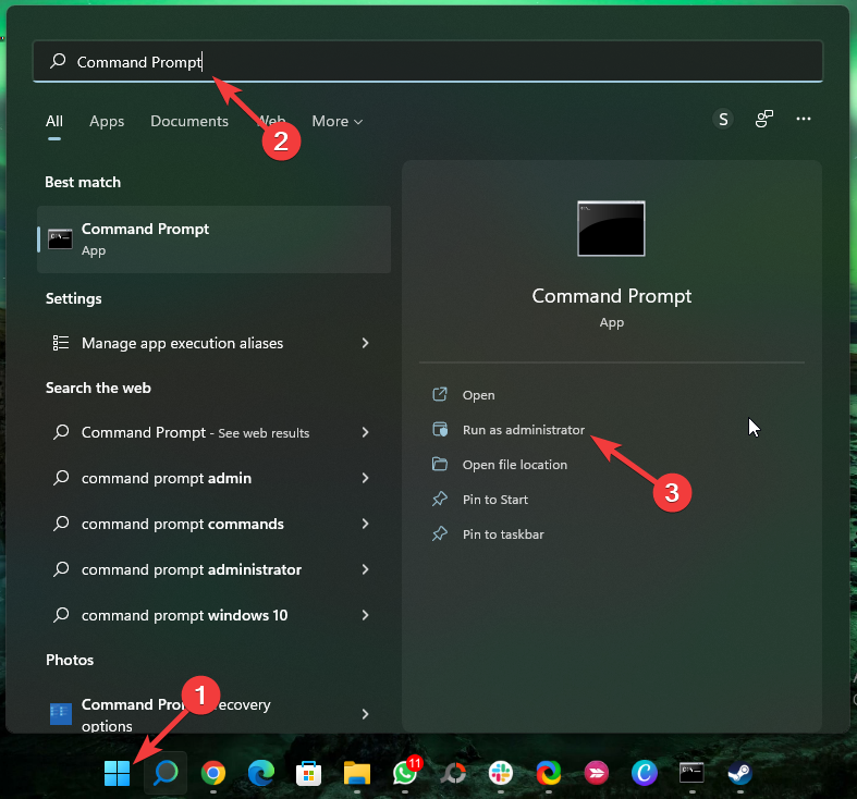 - 单击开始并搜索命令提示符并选择以管理员身份运行。