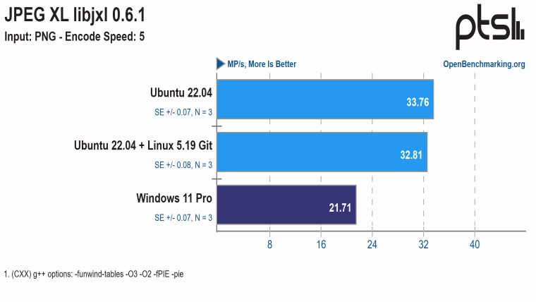 有趣的是,在JPEG图像编码测试中,Linux测试系统在编码速度较低的情况下似乎领先于Windows 11系统。但是,随着编码速度的提高,Microsoft 操作系统也加快了步伐。