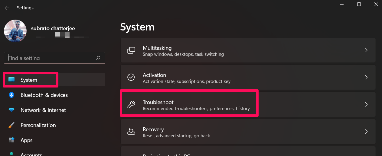 - 最初,打开 Windows 设置,然后在 系统 选项卡下,选择 疑难解答 选项。