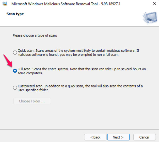 - 然后,选择 完整扫描 并点击 下一步 按钮。