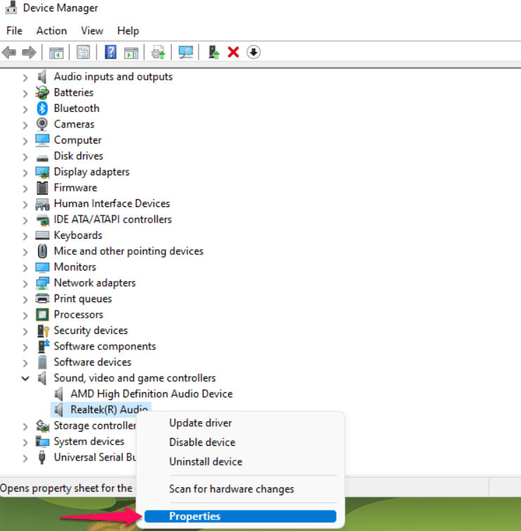 - 右键单击Realtek (R) 音频 并选择 属性 选项。