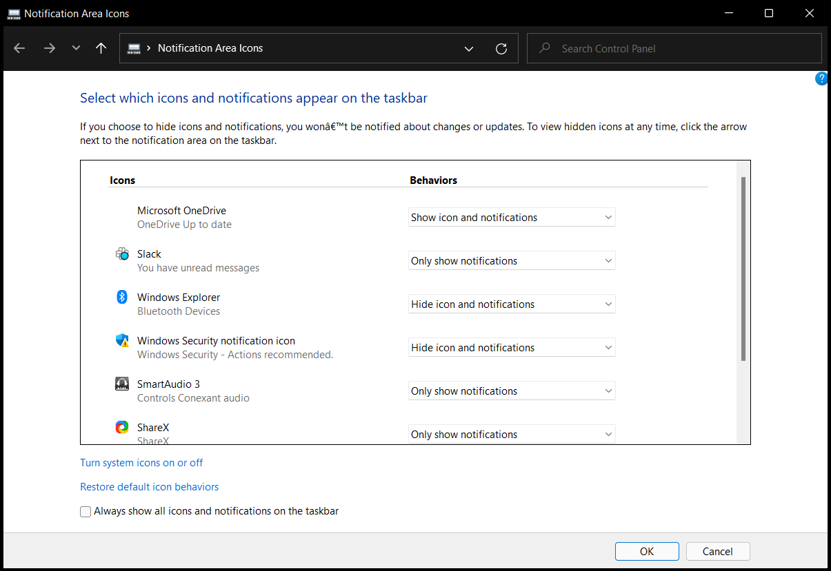 6. 选择选项打开或关闭系统图标并启用所有选项,然后按 OK。