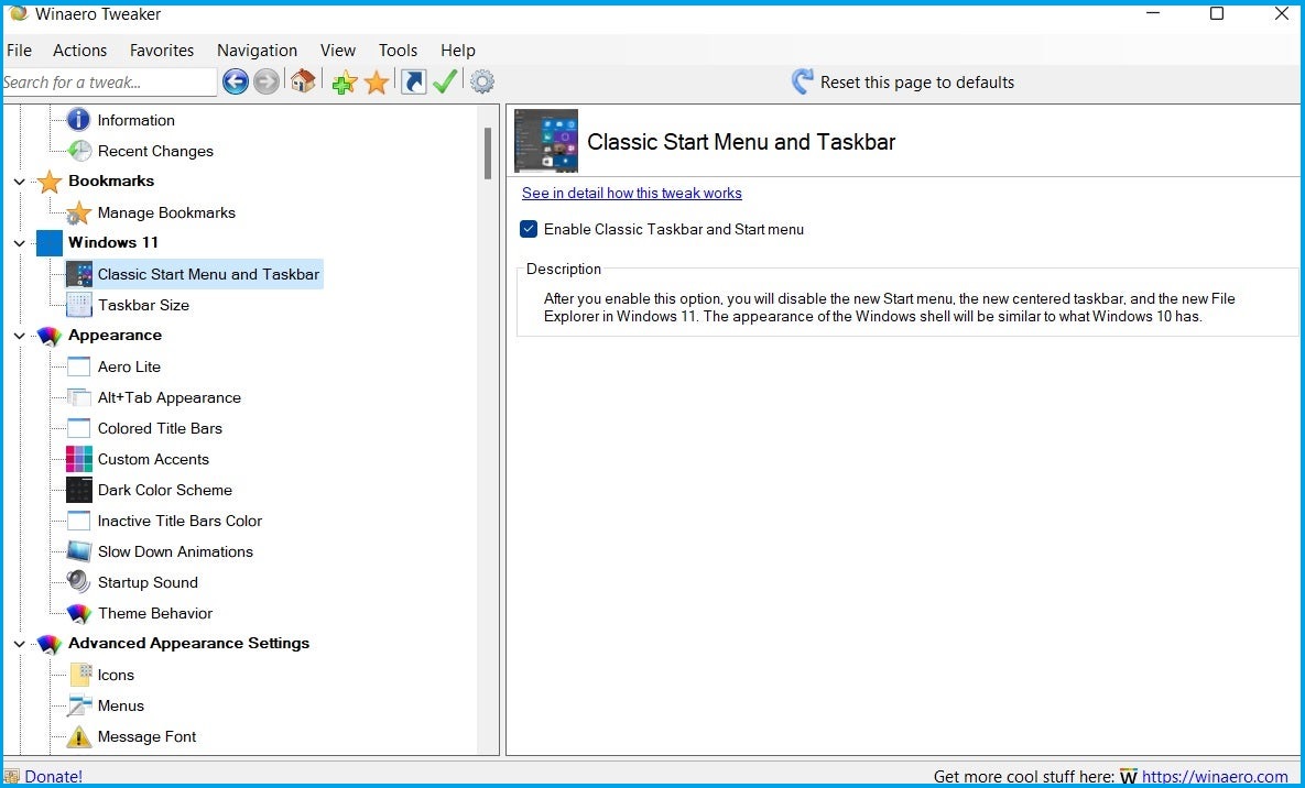 - 打开 Winaero 并设置选项启用经典任务栏和开始菜单