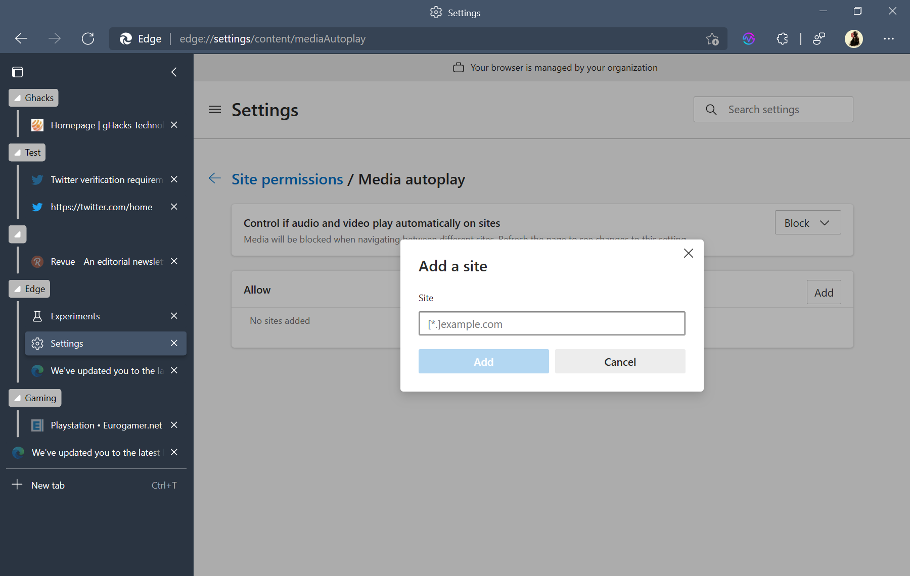 如果您将媒体自动播放设置设置为限制或阻止,但有一个您希望媒体在其上自动播放的站点,您可以使用内置的允许列表来执行此操作。
