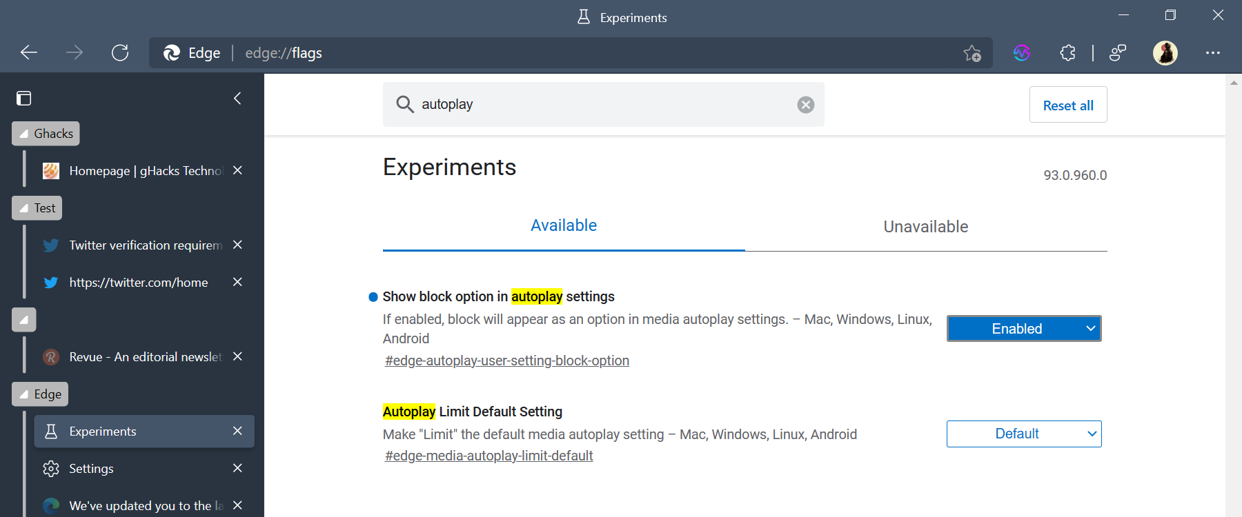 块选项实验已经有一段时间了。我们已经在 2020 年年中对其进行了审查。请参阅如何在新的 Microsoft Edge Web 浏览器中阻止自动播放视频。