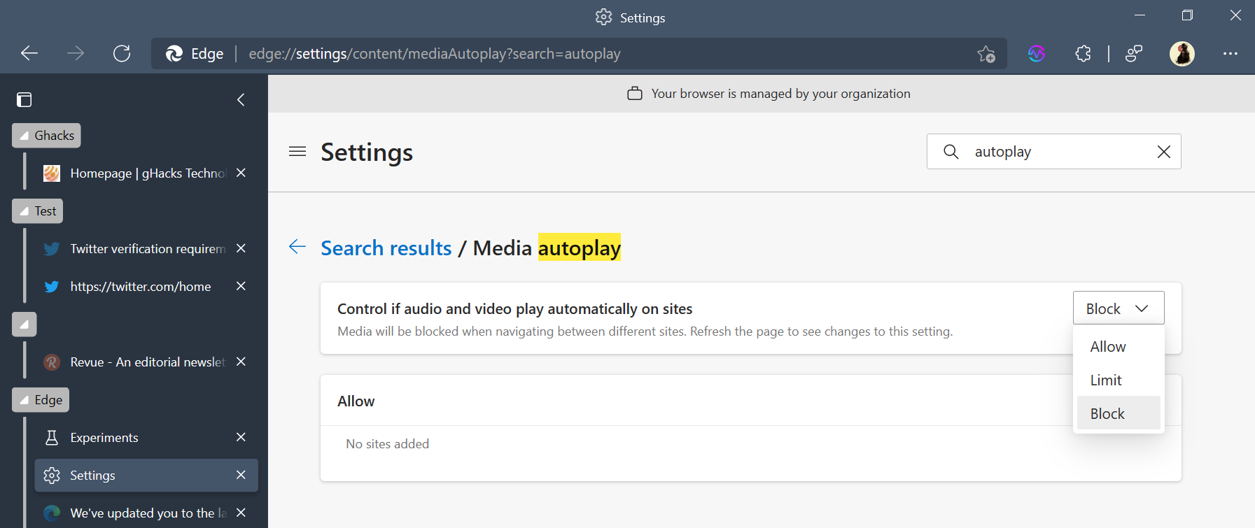 - 再次加载主自动播放首选项页面:edge://settings/content/mediaAutoplay