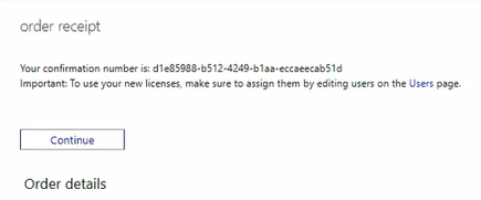订购流程完成后,选择“继续”以返回 Microsoft 365 管理中心控制台。
