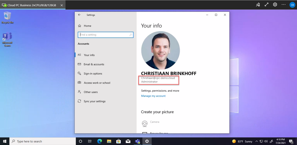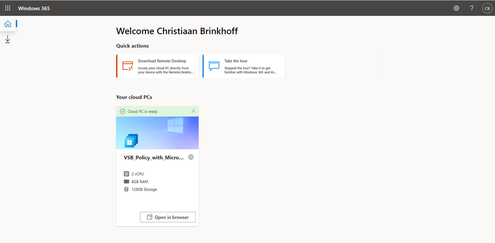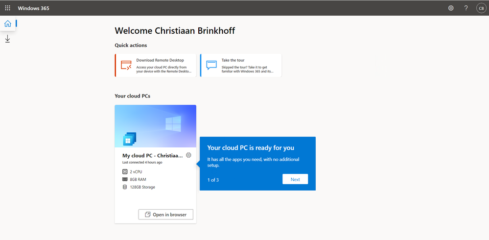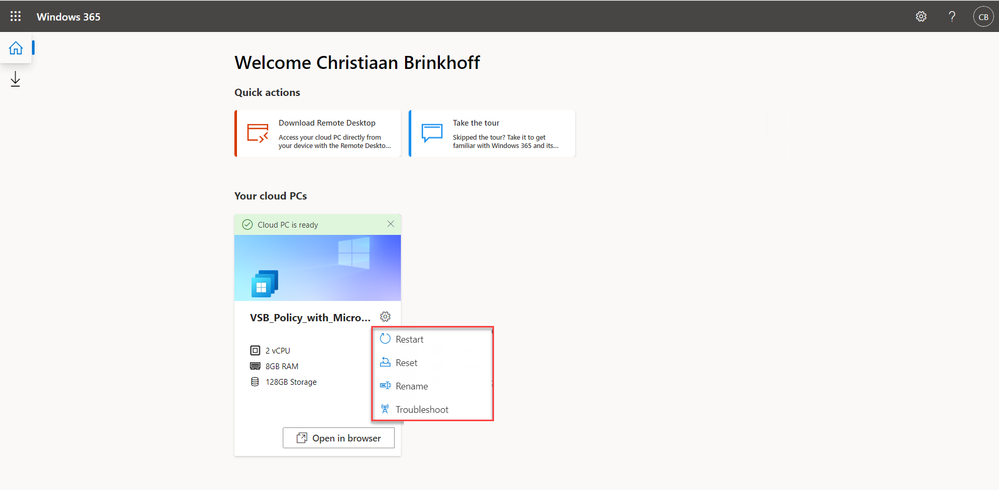 例如,我可以在门户中将我的 Windows 365 云 PC 重命名为“我的云 PC – Christiaan Brinkhoff”。