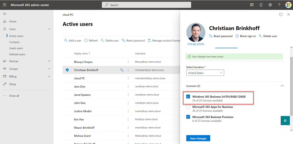 为您的用户分配Windows 365 商业版许可证,并保存您的更改。