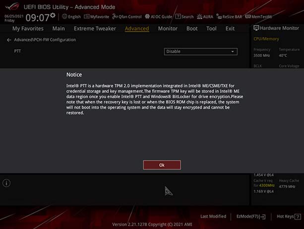 - 转至Advanced\PCH-FW 配置页面,然后单击 PTT 下拉菜单中的启用。