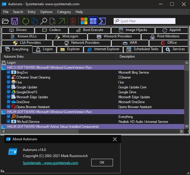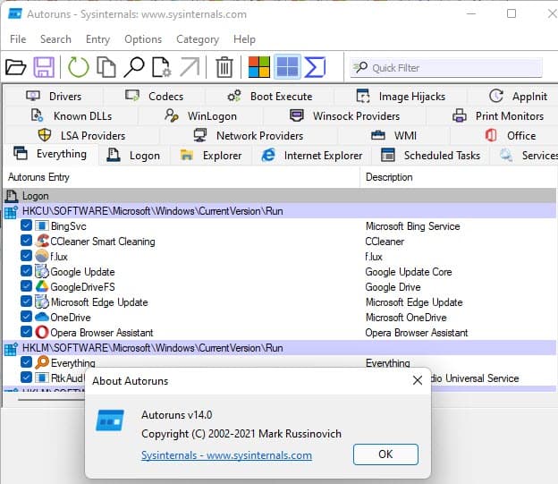 尽管 CCleaner、任务管理器和系统配置 (MSConfig) 实用程序提供了相同的功能,但 Autoruns 是许多管理启动过程的首选工具。
