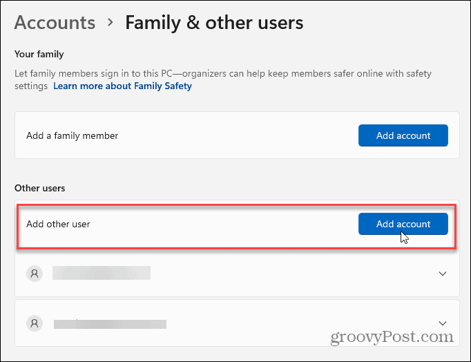 现在,在“其他用户”部分下,单击“添加帐户”按钮。