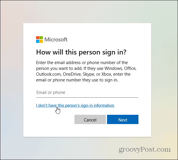 将出现一个屏幕,提示您输入 Microsoft 帐户的用户电子邮件地址。而是单击“我没有此人的登录信息”链接。
