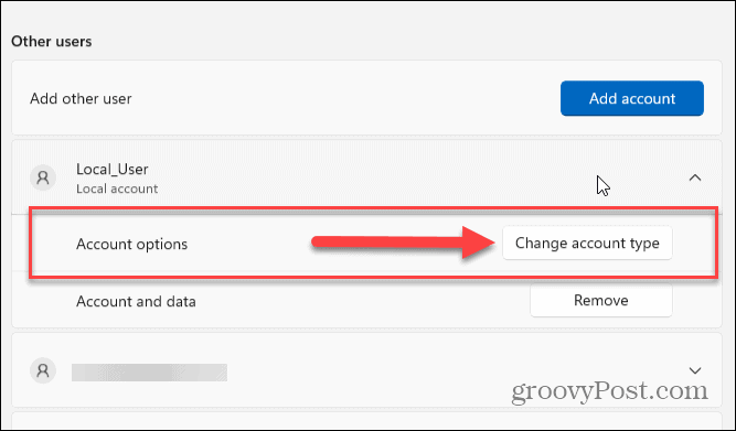 还值得注意的是,您可以更改本地用户的帐户类型。单击设置中的本地用户下拉菜单,然后单击“帐户选项”部分中的更改帐户类型按钮。