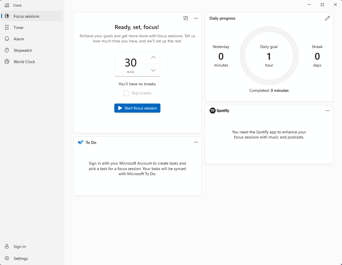 您可以将微软待办与 Focus Assist 联系起来。然后在界面中列出所有当前任务,您可以在激活会话之前选择要关注的任务。最后但并非最不重要的一点是,可以在工作时将 Spotify 集成到流式传输音乐或 Spotify 提供的其他内容。