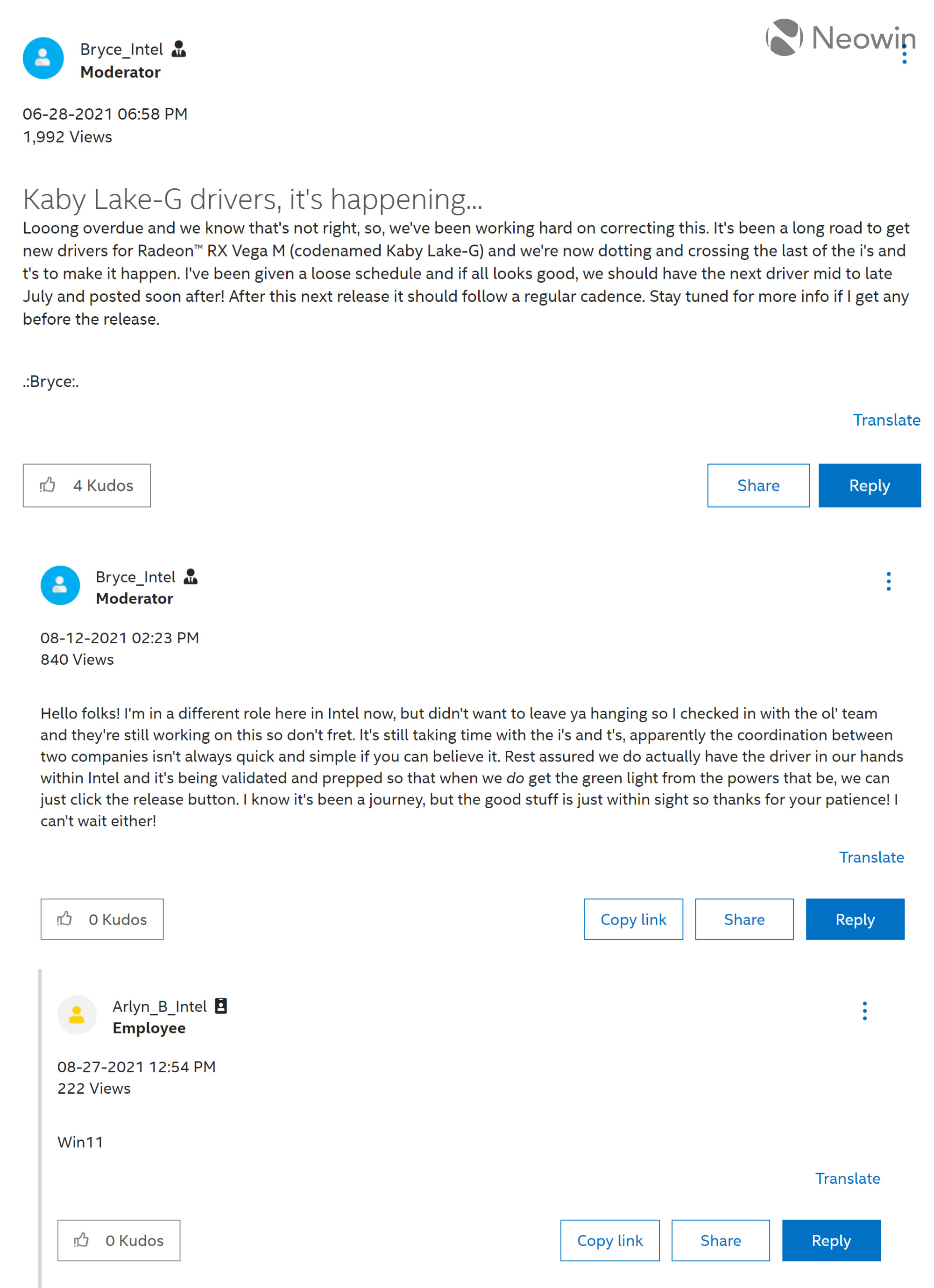然而,该公司于 2019 年 10 月停产。AMD 的驱动程序团队继续为 Kaby Lake G 提供驱动程序一段时间,然后它也于去年 6 月宣布退出产品支持。