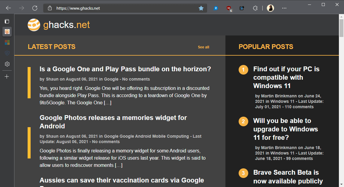 Microsoft Edge 93 在 Web 浏览器的稳定分支中引入了几个期待已久的功能。在垂直侧边栏中显示选项卡的 Edge 用户现在可以隐藏Web 浏览器的标题栏以在使用布局时节省水平空间。